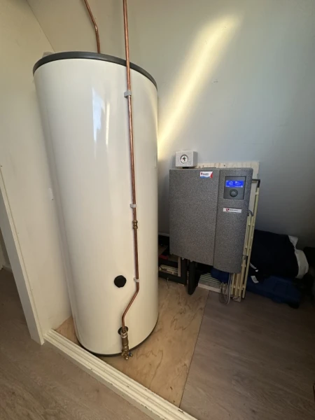 Binnen is gekozen voor de Alpha Innotec HDSV binnenunit, die samen met een 300 liter tapwaterboiler zorgt voor een ruime en comfortabele warmwatervoorziening.