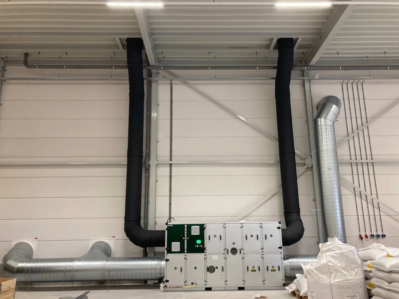 De nieuwe hal is voorzien van vloerverwarming, wat zorgt voor een gelijkmatige en energiezuinige warmteverdeling. Daarnaast is een ventilatiesysteem met luchtdroger toegepast, essentieel voor een stabiel binnenklimaat.